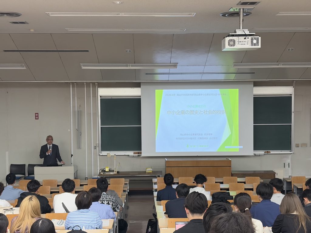 岡山県中小企業家同友会のご協力による本講義も17年目を迎え、昨年に引き続き対面形式で200名近くの学生が出席して開講しました。開講式では尾関学経済学部長の挨拶の後、岡山県中小企業家同友会代表理事で(有)まるみ麹本店 代表取締役 山辺啓三氏からご挨拶を頂き、続いて山辺氏に「中小企業を知る-中小企業の歴史と社会的役割-」というテーマでご講義頂きました。